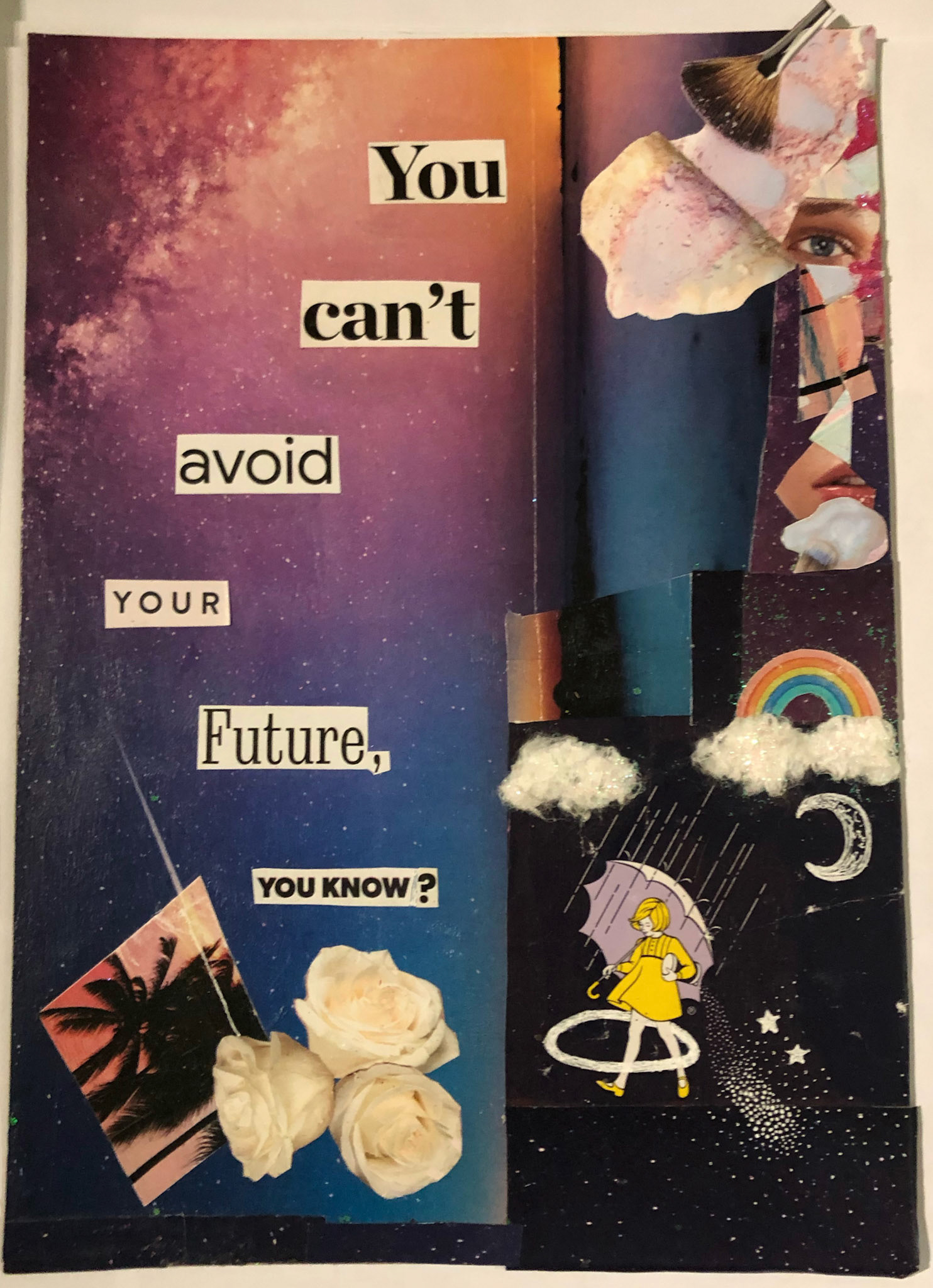 Ad clippings, glitter glue, and cotton on paper